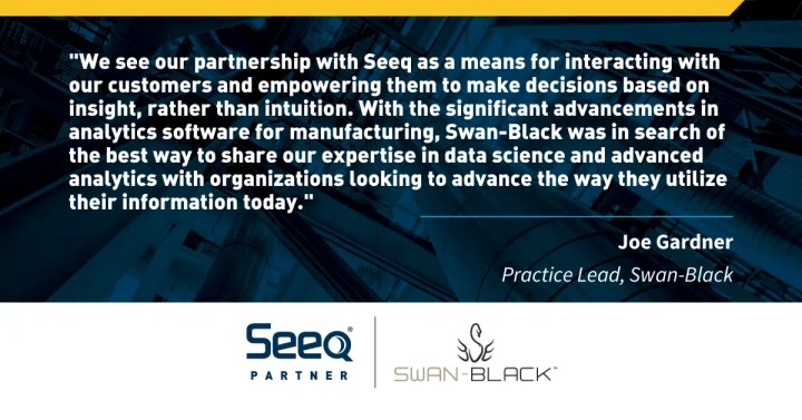 “We see our partnership with Seeq as a means for interacting with our customers and empowering them to make decisions based on insight, rather than intuition. With the significant advancements in analytics software for manufacturing, Swan-Black was in search of the best way to share our expertise in data science and advanced analytics with organizations looking to advance the way they utilize their information today. We believe we have discovered that in our partnership with Seeq. By becoming a Seeq Certified Partner with Seeq Super User Certification, we now have access to the right tools which will allow us to leverage our expertise with advanced analytics and help our customers improve process efficiency.” Joe Gardner, Practice Lead, Swan-Black.