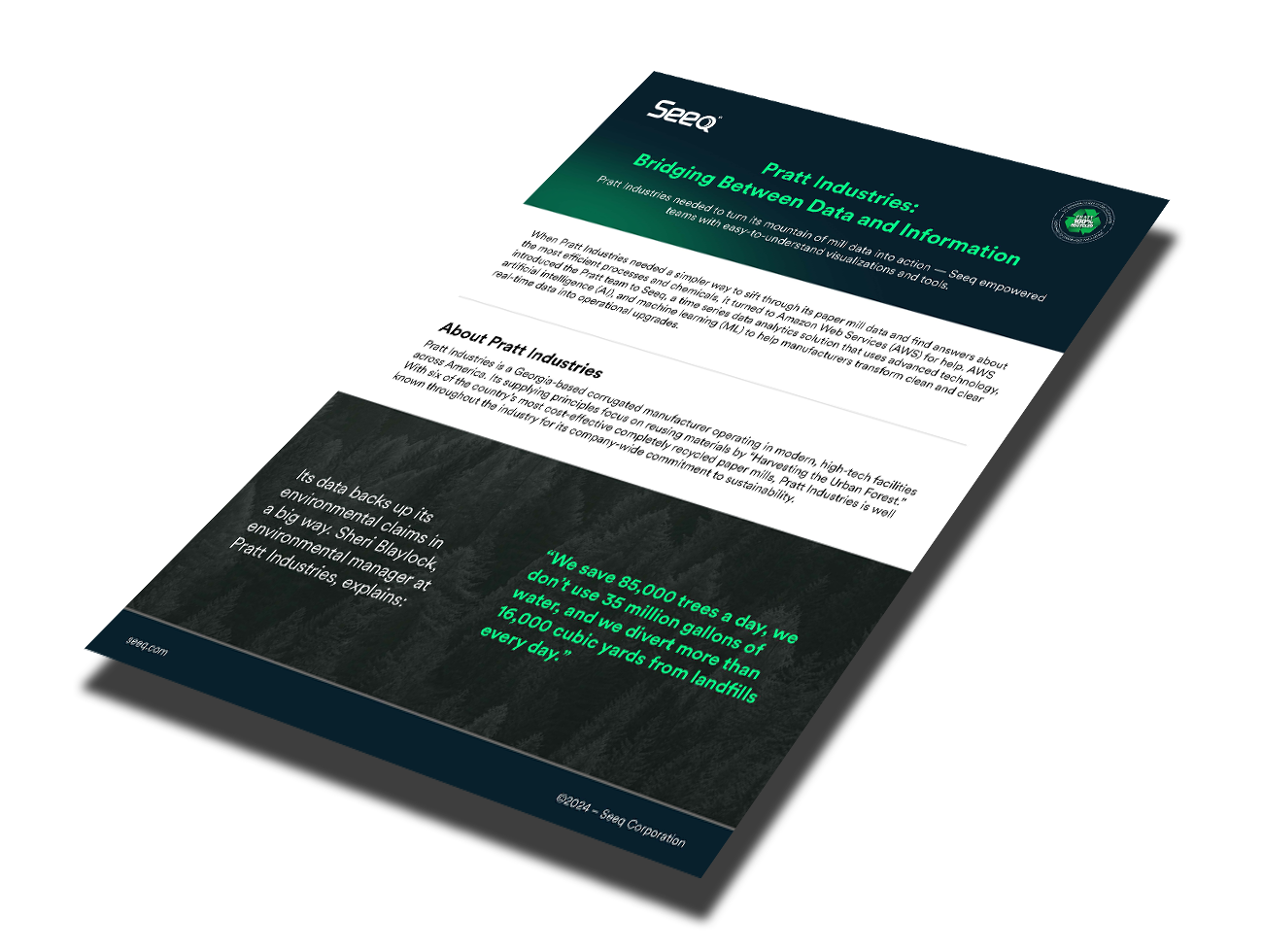 When Pratt Industries needed a simpler way to sift through its paper mill data and find answers about the most efficient processes and chemicals, it turned to Amazon Web Services (AWS) for help. AWS introduced the Pratt team to Seeq, a time series data analytics solution that uses advanced technology, artificial intelligence (AI), and machine learning (ML) to help manufacturers transform clean and clear real-time data into operational upgrades.